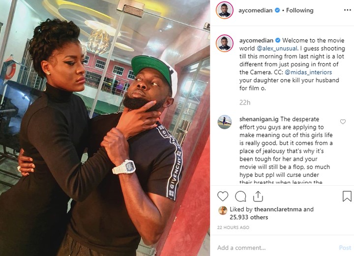 “Welcome to the movie world @alex_unusual. I guess shooting till this morning from last night is a lot different from just posing in front of the Camera. CC: @midas_interiors your daughter one kill your husband for film o.”